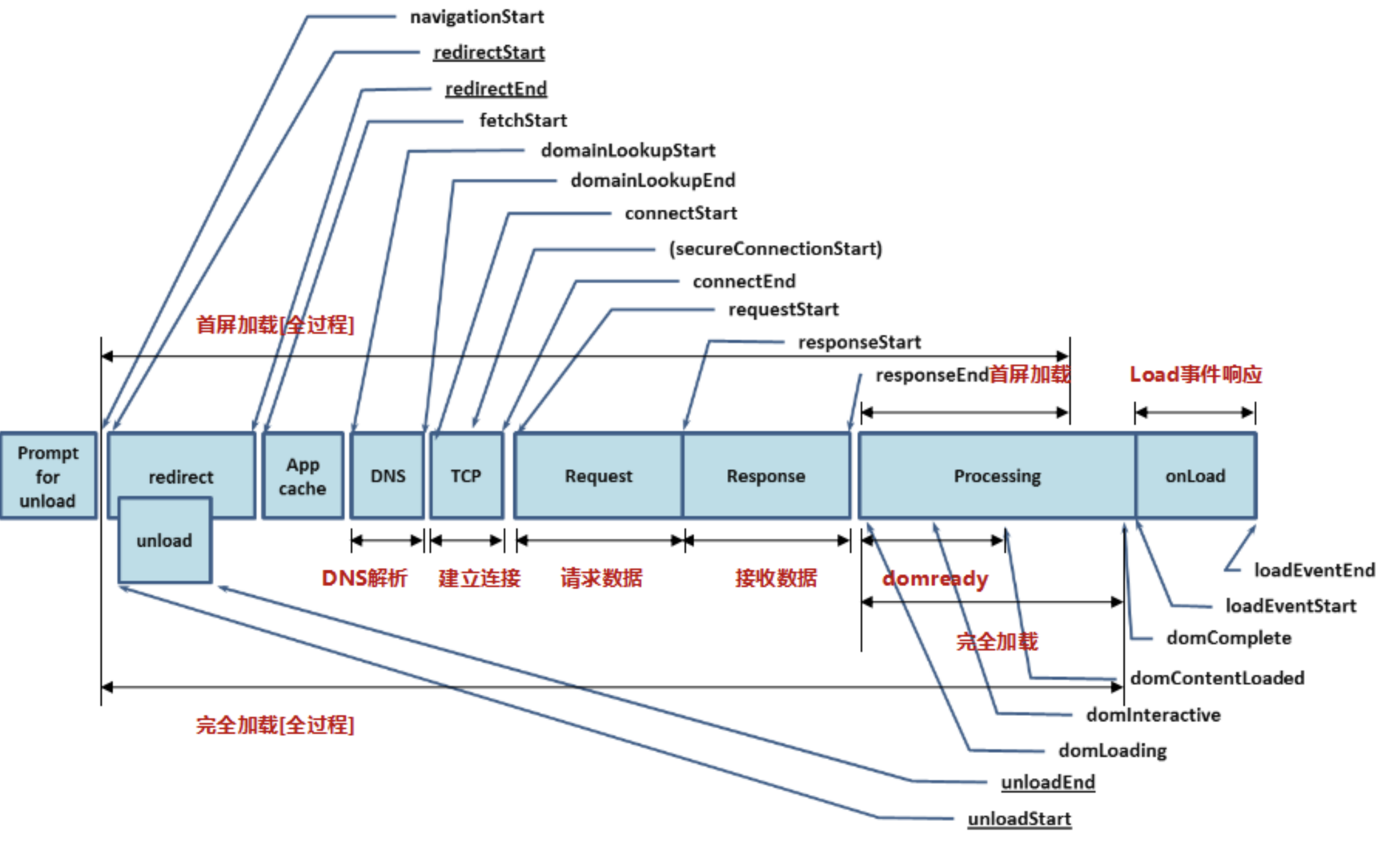 fetchStart:发起获取当前文档的时间点,我的理解是浏览器收到发起页面请求的时间点;domainLookupStart:返回浏览器开始DNS查询的时间,如果此请求没有DNS查询过程,如长连接、资源cache、甚至是本地资源等,那么就返回fetchStart的值;domainLookupEnd:返回浏览器结束DNS查询的时间,如果没有DNS查询过程,同上;connectStart:浏览器向服务器请求文档,开始建立连接的时间,如果此连接是一个长连接,或者无需与服务器连接(命中缓存),则返回domainLookupEnd的值;connectEnd:浏览器向服务器请求文档,建立连接成功的时间;requestStart:开始请求文档的时间(注意没有requestEnd);responseStart:浏览器开始接收第一个字节数据的时间,数据可能来自于服务器、缓存、或本地资源;unloadEventStart:卸载上一个文档开始的时间;unloadEventEnd:卸载上一个文档结束的时间;domLoading:浏览器把document.readyState设置为“loading”的时间点,开始构建dom树的时间点;responseEnd:浏览器接收最后一个字节数据的时间,或连接被关闭的时间;domInteractive:浏览器把document.readyState设置为“interactive”的时间点,DOM树创建结束;domContentLoadedEventStart:文档发生DOMContentLoaded事件的时间;domContentLoadedEventEnd:文档的DOMContentLoaded事件结束的时间;domComplete:浏览器把document.readyState设置为“complete”的时间点;loadEventStart:文档触发load事件的时间;loadEventEnd:文档出发load事件结束后的时间