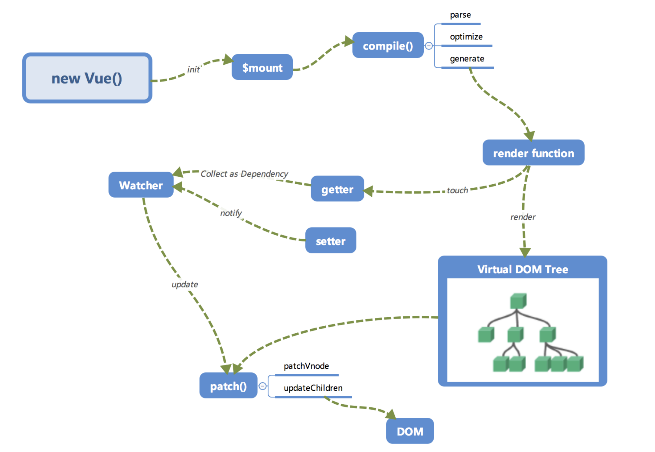 template转换成render函数(这里要注意的是我们在开发时尽量不要使用template,因为将template转化成render方法需要在运行时进行编译操作会有性能损耗,同时引用带有compiler包的vue体积也会变大。默认.vue文件中的template处理是通过vue-loader来进行处理的并不是通过运行时的编译 - 后面我们会说到默认vue项目中引入的vue.js是不带有compiler模块的) - 模板编译过程